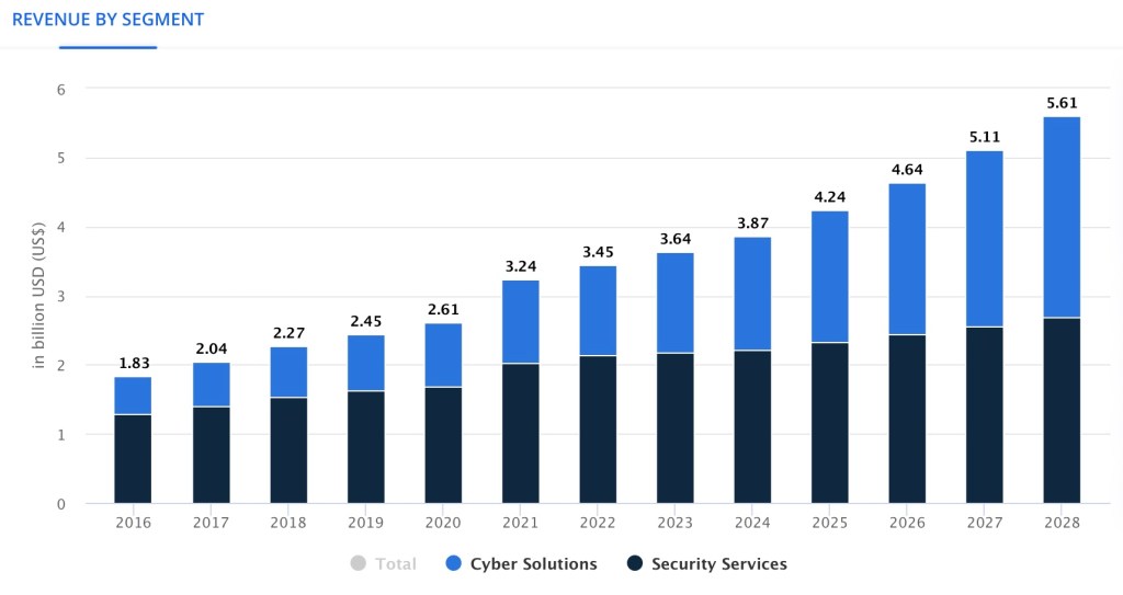 首先值得肯定的是,网络安全行业在澳大利亚,甚至在全球范围内都发展迅猛。根据statista 2023年9月发布的澳洲网络安全市场数据和预测显示,在过去七年中,行业总收益从2016年的18.3亿美元增长至2022年的34.5亿美元,几乎翻倍;而根据其预测未来数年行业仍然处于高速发展阶段,预计至2028年,行业总收益将会达到56.1亿美元。不过从细分市场来看,网络安全解决方案的增速明显大于安全服务的速度。
